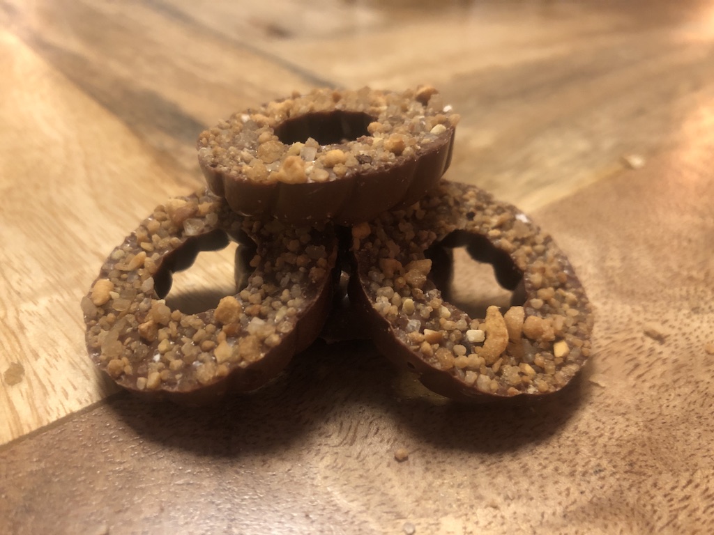Melkchocolade kerstkransjes met krokante hazelnoot stukjes.
