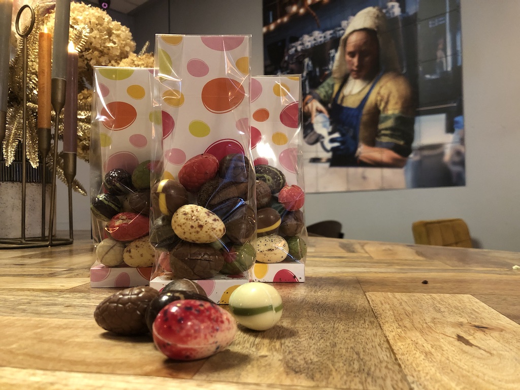 Een zakje gemengde paaseitjes van praliné tot gezouten caramel.
