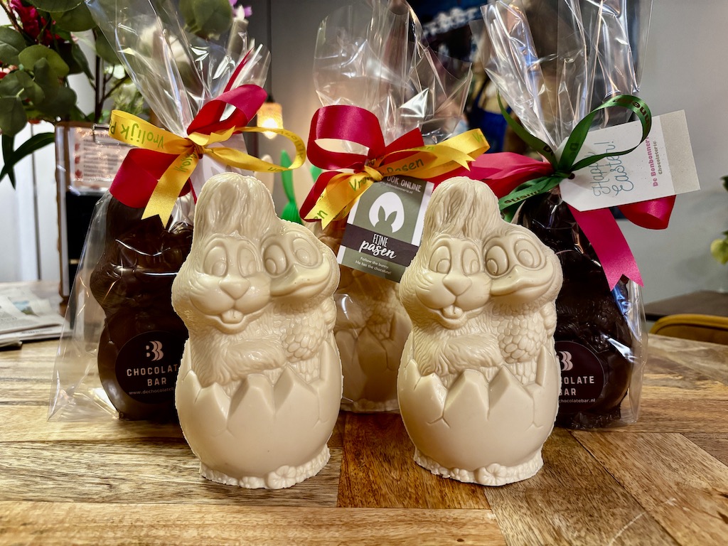 netjes verpakt en afgewerkt met vrolijk kleuren lint en een vrolijk pasen kaartje.